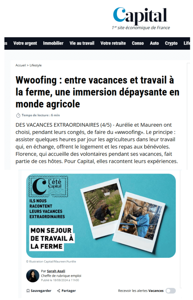- Aurélie et Maureen ont choisi, pendant leurs congés, de faire du «wwoofing». Le principe : assister quelques heures par jour les agriculteurs dans leur travail qui, en échange, offrent le logement et les repas aux bénévoles. Florence, qui accueille des volontaires pendant ses vacances, fait partie de ces hôtes. Pour Capital, elles racontent leurs expériences.